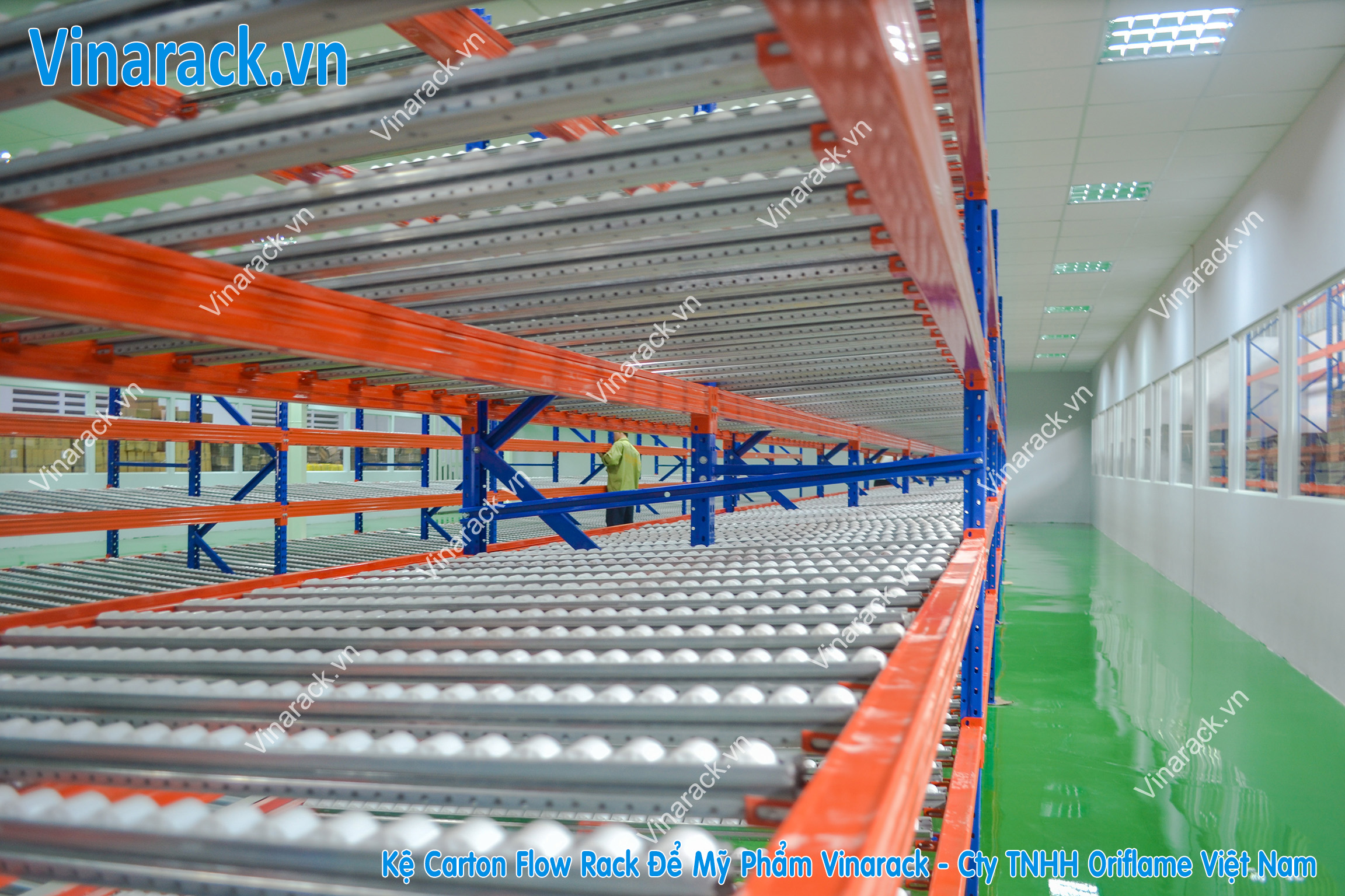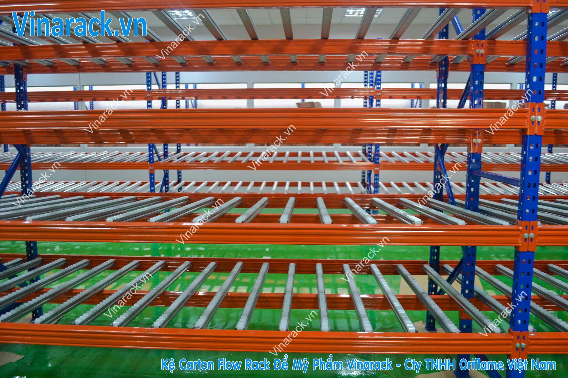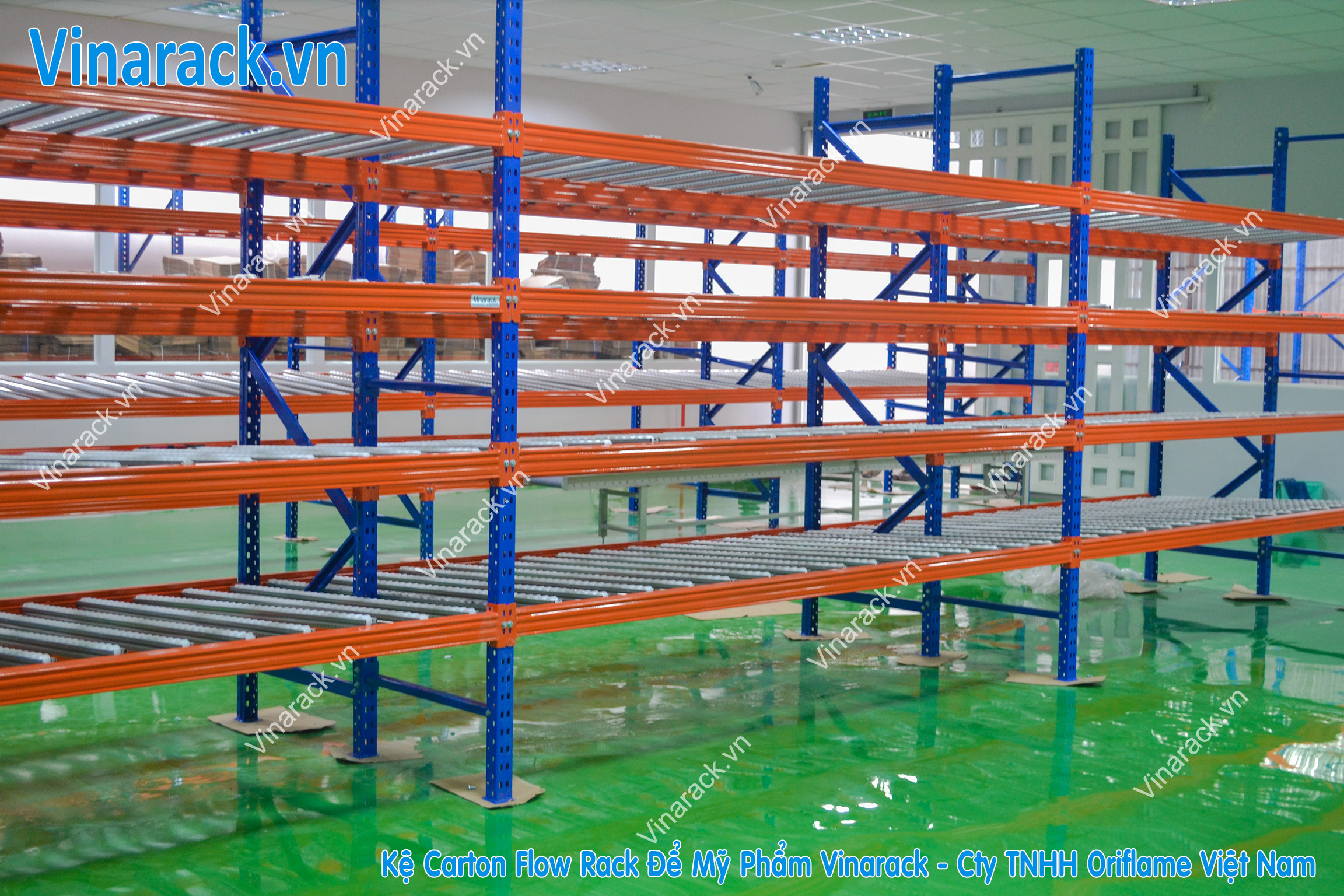 Carton Flow Racking Vinarack is an automatic storage solution (Live Storage), designed according to the conveyor movement technique with slope, forming the moving force of the cargo boxes or trays moving to one side (do not use use pallet).